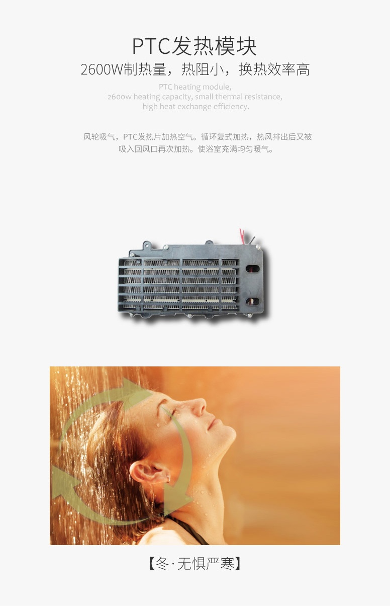 冬·無懼嚴寒:2600W制熱量,風輪吸氣,PTC發熱片加熱空氣。循環復式加熱,熱風排出后再吸入再次加熱,使浴室充滿均勻暖氣。