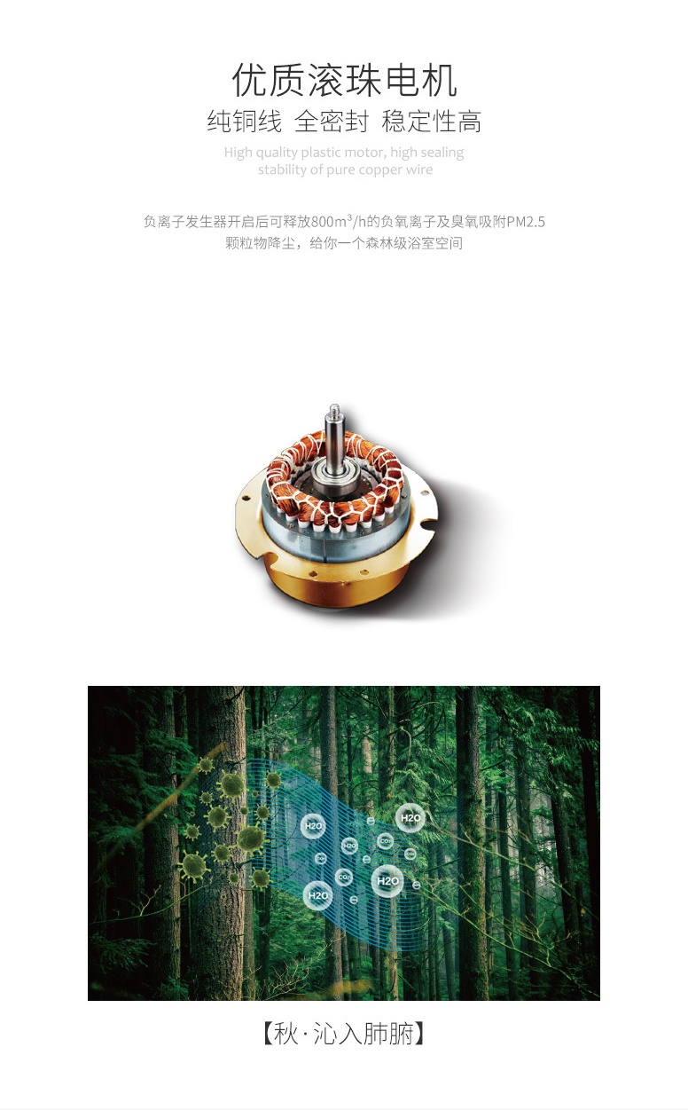 秋·沁入肺腑:負離子發生器開啟后可釋放800m3/h的負離子及臭氧吸附顆粒物降塵,給你一個森林級浴室空間